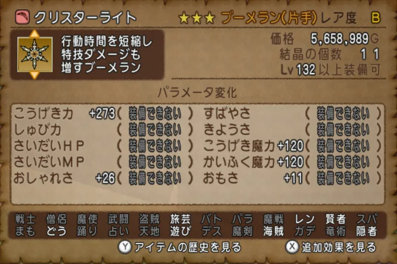 | LV132 クリスターライト | こうげき力+273 おしゃれさ+26 こうげき魔力+120 かいふく魔力+120 おもさ+11 |