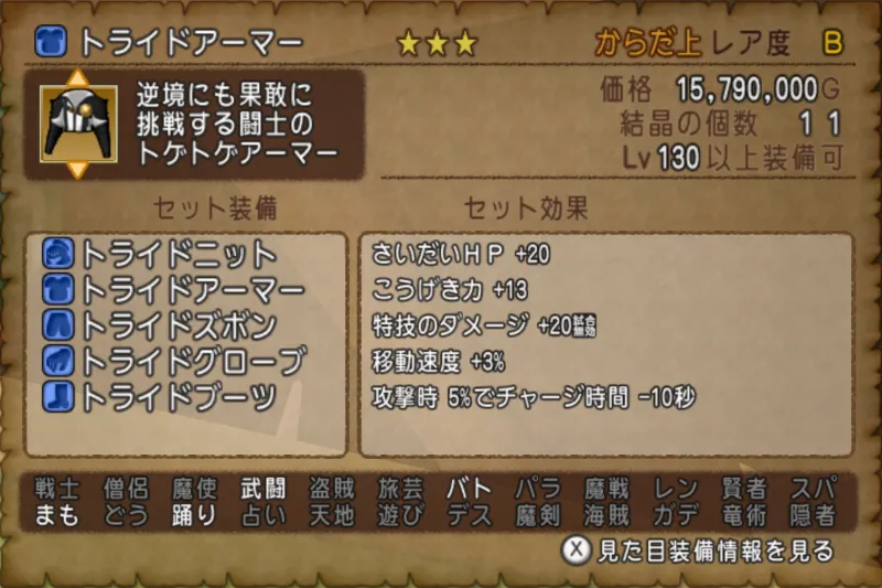 多くの前衛職と変わらずですが、うで装備でかいしん率埋めを付けつつあとは敵次第で耐性を揃えていきましょう。聖域の闘衣は5か所セットになっていて空白の箇所が無いので全てを同装備で集める必要があります。